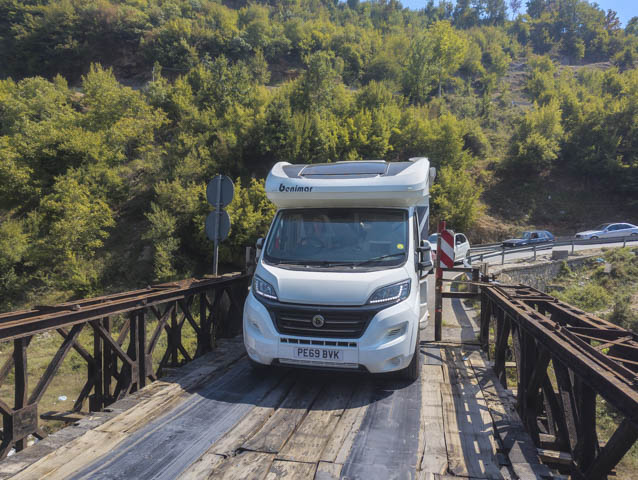 Unlike the Kosovo border there isn’t anywhere at the Albanian border to buy insurance for the motorhome, so we drove to the nearest sizable town of Bajram Curri (via a very narrow bridge that we only just managed to fit), where we parked on the main square about 100m from a Vodaphone shop and bought a couple of local Sim cards for €25 each (the most expensive we’ve had so far and with hindsight completely unnecessary because our Kosovo Sim continued to work throughout our time in Albania).