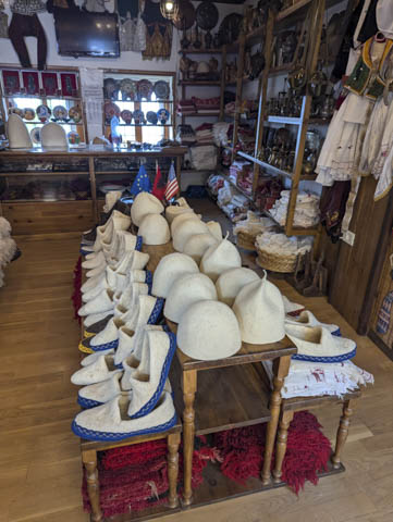 Kruja’s narrow, cobbled Bazaar is mostly filled with tourist souvenirs but there are a couple of little gems hidden amongst them, including a shop with traditional felt products such as slippers, lampshades and different types and sizes of Qeleshe (white felt skull caps). Apparently, you can tell which part of Albania someone is from by the height and shape of the Qeleshe they wear! The owner wasn’t keen on us taking photos but he did invite us downstairs into his workshop where he patiently answered all our questions and even demonstrated how he made his own felt from a pile of wool in the corner.