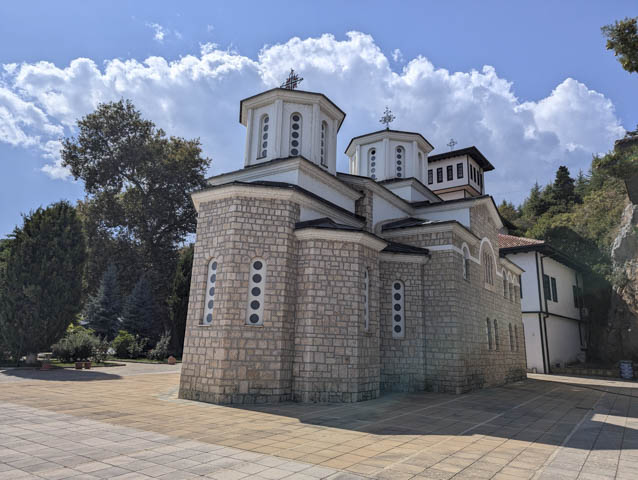 Further still along the shore is the Sveti Naum Monastery. This was unlike any other monastery we had seen so far on this trip, in that it seemed more like a monastery theme park. There is a boating lake with boat trips to the Springs, roaming peacocks, restaurants, a hotel and souvenir shops lining the promenade up to the monastery. The place is a money-making machine with coachloads of people being bussed in, including from over the border in Albania. The original church on this site was built in 900 but this was destroyed by The Ottomans in the 15th century and the current Church of Sveti Naum was rebuilt in the 16th and 17th centuries.