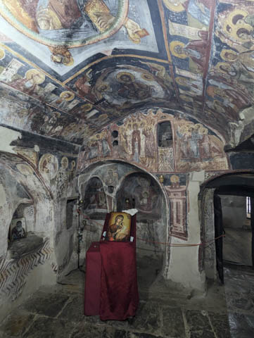 The real reason for visiting this monastery complex however is not the beautiful lakeside location, attractive monastery church, or the smaller Church of St. Peter and Paul, it is the connected 14th century cave church. There is a small fee for entering the cave church but as there wasn’t anyone on the desk when we arrived we entered without charge, although the lights were off and we had to sneakily locate the key to turn them back on!