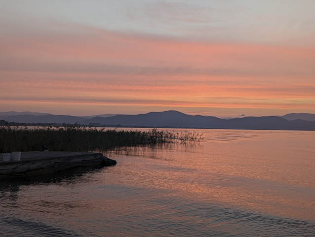 A short cycle from the campsite is Kalista Monastery. The monastery’s church has a great position overlooking Lake Ohrid and unusually, we were able to access the upper floor of the church which provided a great viewing platform. While we were visiting, a boat arrived with a bride and groom and their wedding party. Not a bad wedding venue!