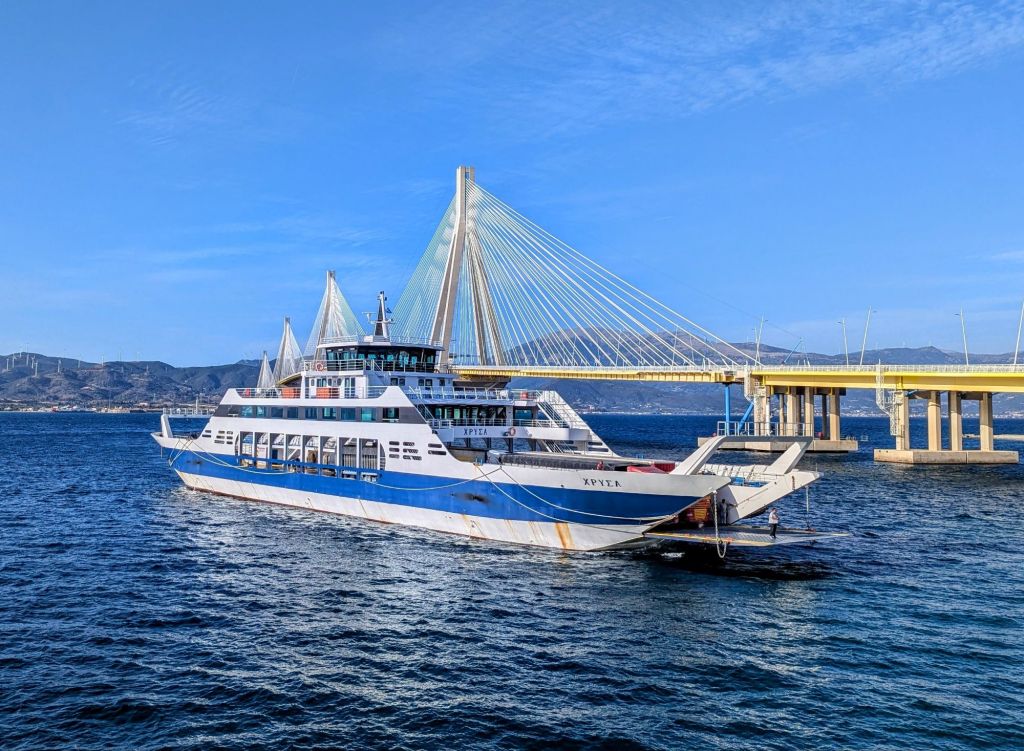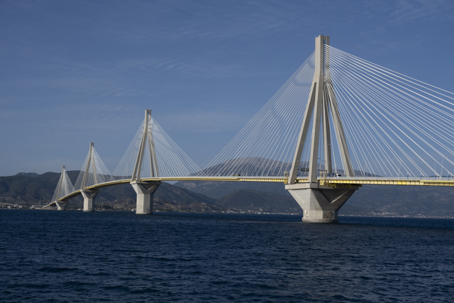 The first question was how to cross the Gulf of Patras. We had taken the bridge on the way over but this time we wanted to try out the cheaper ferry option. It was well sign posted – until you got down to the dockside, and then there were no signs at all and ferries in a number of different places. We somehow managed to figure it out and drove onto a waiting ferry – although we were a little nervous as to whether we had chosen correctly until a man appeared at our window with the tickets.