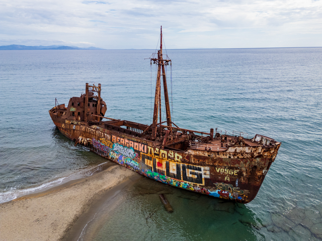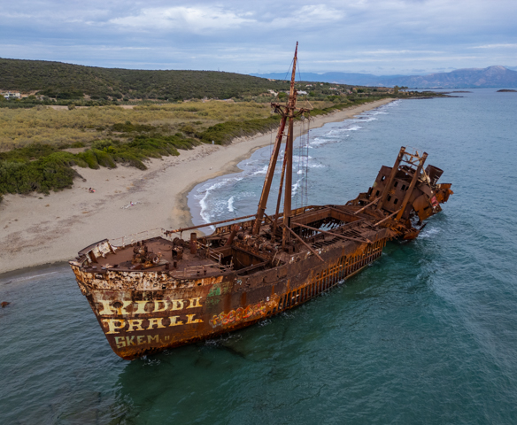 Leaving Monemvasia we drove West along the coast and stopped at a sandy beach to visit the shipwreck of the Dimitros. This is a 67m long 1000 ton cargo ship that was used to smuggle cigarettes between Turkey and Italy before being seized by port authorities. It was deliberately released from the port and set on fire to hide the evidence.