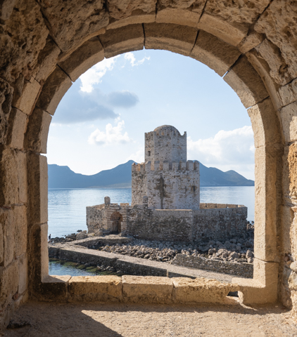 Only a few kilometres along the coast from here is the town of Methoni, which has a large castle on a promontory sticking out into the sea, built by the Venetians in the 13th century. It is one of the largest castles in the Mediterranean and off the tip of the mainland is a fortified inlet, which was used as a prison and place of execution during the Turkish occupation. Called Bourtzi it was built in 1500 and is connected to the main castle by a narrow paved walkway.
