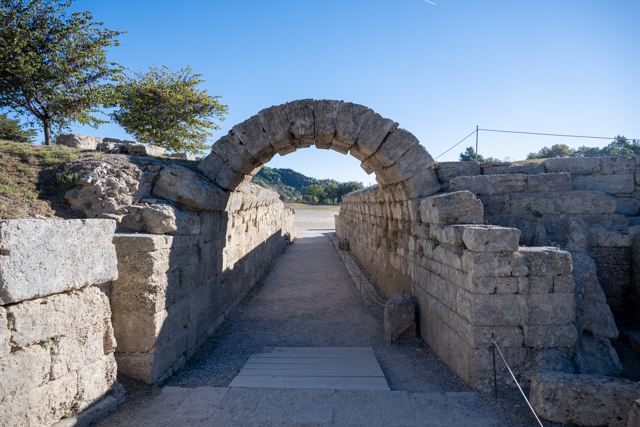The original stadium where the games were held can be visited but it is just a depression in the ground. However, the original entrance to the stadium has been reconstructed and you can also see a row of 16 stone pedestals leading down to the entrance, which were engraved with the names of cheats to shame the athletes, their city and to dissuade others from cheating. In ancient times, bronze statues of Zeus (Zanes) would have sat atop the pedestals.