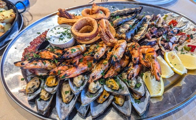 We decided to treat ourselves to a dinner of seafood while we were here and on a cold and windy evening went to a seafront restaurant in the new town which was practically deserted. The massive platter of seafood that we were served was superb and we thoroughly enjoyed it, not least because throughout the Balkans there had been very little fish on the menu. Afterwards of course there was the obligatory Limoncello and some custard tarts to finish.