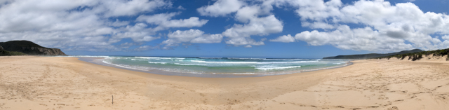 From here we headed back towards the coast with our first stop at Jeffrey’s Bay. This is one of the premier surfing locations in the world and we visited a beach called Supertubes which has big clean waves for surfing – in the winter. Right now there were no real waves and certainly no one out surfing. It was however a lovely beach.