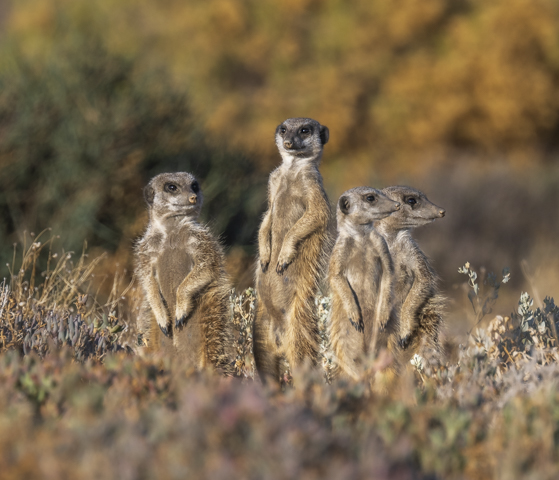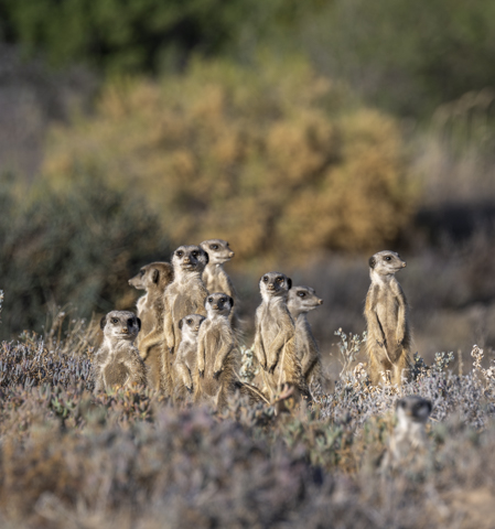 Meerkats like to warm up in the morning before starting their day and they stand up, resting on their hinged tails, with their bellies pointed to the sun to warm themselves for up to an hour before starting their day foraging for food.