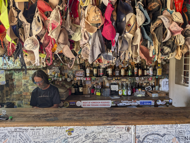 The bar itself is quite small and the walls are plastered with graffiti, bank notes and other things, and from the ceiling hang hundreds of signed bras donated by patrons. We stopped off for a drink and met the characterful Ronnie, his wife and son (who was behind the bar) before getting back on the road and continuing on our way.