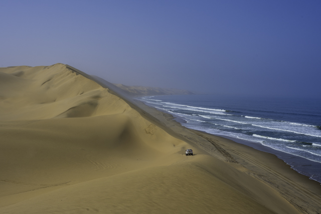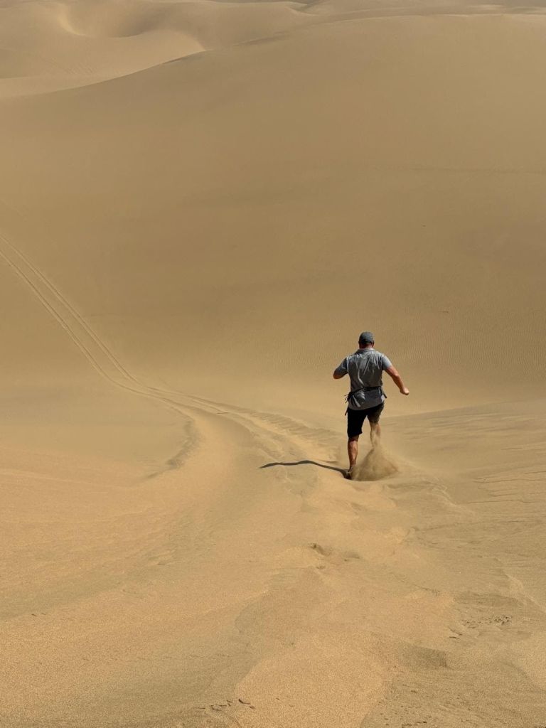 The views were amazing as we were surrounded on all sides by huge sandy dunes. We stopped to have a look around and take in the surroundings and then our guide offered us the chance to run down a huge dune to the beach where he would meet us. I was off taking giant strides down the 45 degree slope and flying down in an avalanche of sand. It was exhilarating.