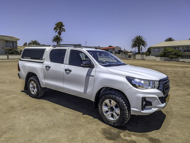 Our car hire for Namibia isn’t the normal cheapest small car that we can get. The roads here can be rough and most of them aren’t tarmacked. So we’ve hired a double cab Toyota hilux 4×4. Its almost as long as out camper.