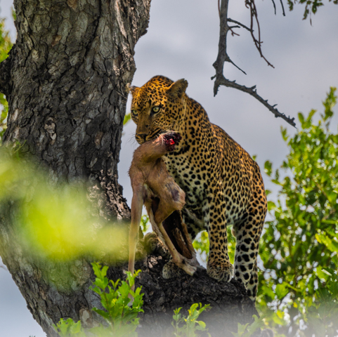 We arrived in the nick of time, as only a few minutes later the Leopard got up, climbed to a different branch of the tree to retrieve a half eaten Impala carcass, before descending with its lunch and slinking off into the bushes. We were off to a fantastic start!
