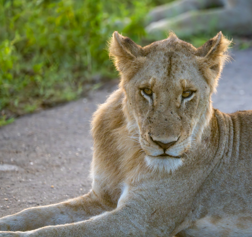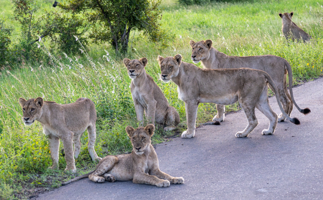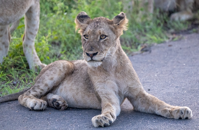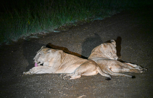 The Lions apparently like to sleep on the tarmac roads because they retain the heat of the day and are dry, unlike the dewy grass.