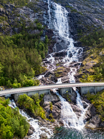 As we headed North we came to one of the most impressive and biggest waterfalls in Norway – Langfoss. This has a total height of 612m and the road actually runs across the bottom of it before it finally reaches the Fjord. CNN has actually named it one of the top ten waterfalls in the world, although its easy accessibility probably has something to do with that.