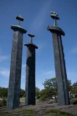 After a rejuvenating but pricey hot chocolate and slice of cake we took a short drive outside of town to visit the Swords in the Stone or Sver I Kjell. This is an impressive sculpture of three enormous swords sunk into the rock overlooking the sea, as a tribute to the Battle of Hafrsfjord in 872 where King Harald Fairhair unified Norway.