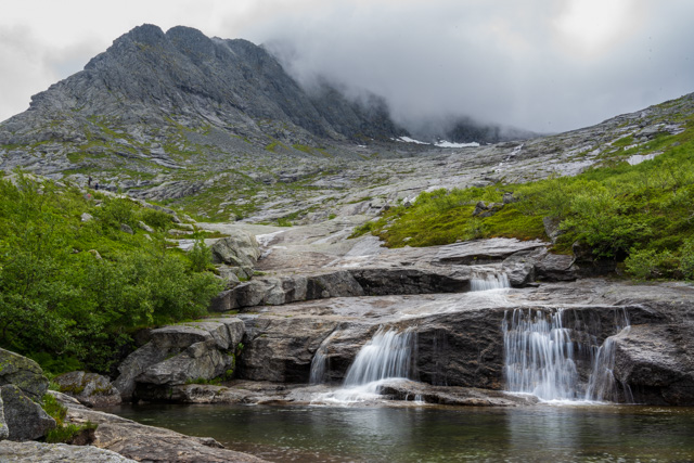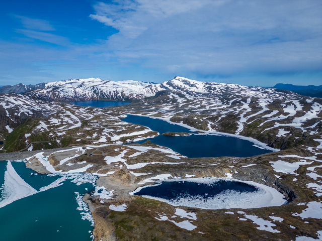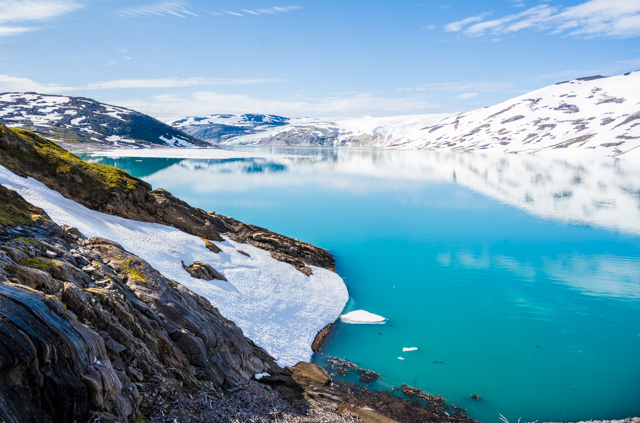 As you drive North from the glacier a long tunnel takes you through the mountainside and to a different fjord. From here there are roads that run up into the mountains and to two big dammed mountain lakes – the Holmvasdammen and the Storglomvassdammen.