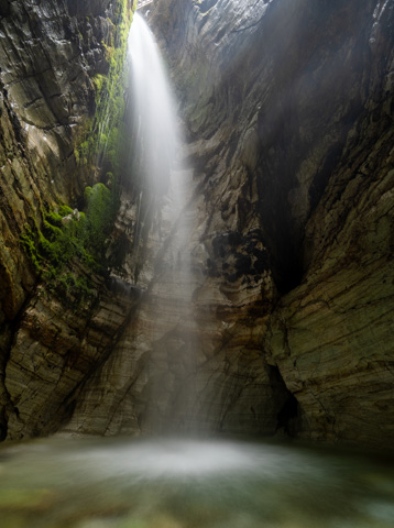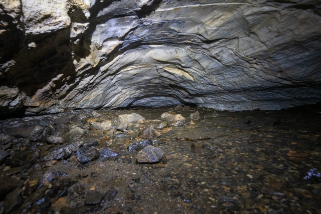 The first cave is the biggest. Here a long narrow tunnel with a small river leads through into a large chamber which is open to the sky and within which, a waterfall plunges down from the cave above.