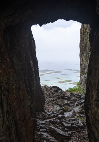 After Trondheim we carried on heading North to the island of Torget which is connected to the mainland by a bridge. This is the home of The Torghatten granite dome which is well known for the big natural tunnel that goes through it. There is a short hike up into the tunnel and down the other side. The tunnel itself is 35 metres high and 160 metres long.