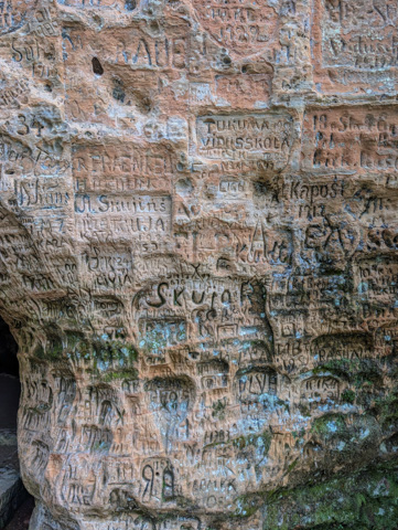 On the way to Turaida Castle from Sigulda we made a brief stop at the famous Gutman’s Cave, a shallow cave in a hillside which has had thousands of engravings carved into it.