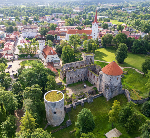The town is also known for its ruined castle in a park just next to the old town . At one time it was the largest castle in Livonia (the territory of the Livonian Brothers of the Sword who ruled what is now Estonia and Latvia from the 13th century until the 16th century), but it was damaged in the early 1600s in the Polish-Swedish war.