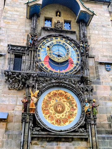 We arrived at the old town via the Charles Bridge which was the only bridge across the Vltava river until 1814 and it was built in the 1300’s. Once across the bridge you are into the medieval centre of the city and it is only a short distance to the Old Town Square which houses the famous Prague Astronomical Clock (or Prazsky orloj). The clock is famous for its hourly show where the twelve apostles appear in small doors a the top of the clock.