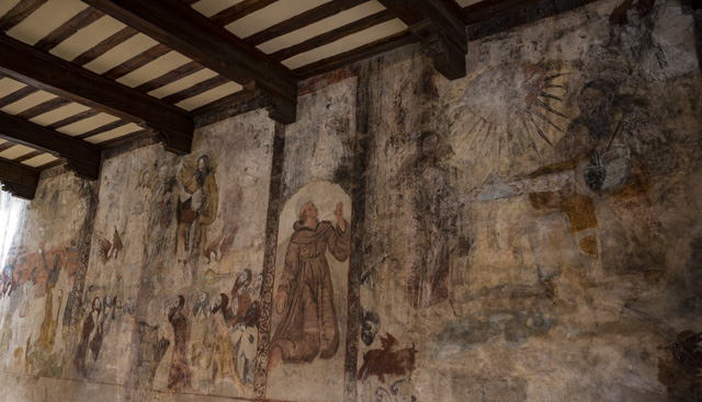 The church has a 2 storey cloister which has very well preserved original paintings on the ground floor walls and some intricate carvings on the internal stone pillars.