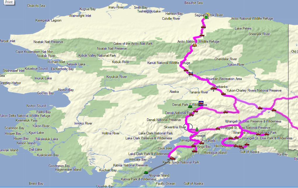 We drove from the Canadian border (crossing at the Top of the World Highway) up to Prudhoe Bay and then back down to the Kenai peninsula before heading back out along the Alaska Highway.