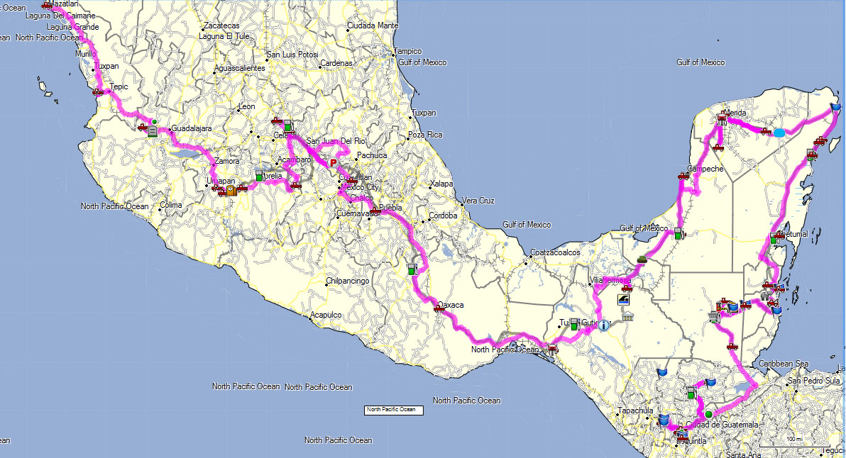 Once on the Mainland we headed inland from Mazatlan and via Mexico City headed South to near the Guatemala border before doing a loop round the Yucatan and into Belize.